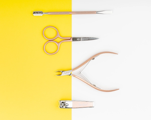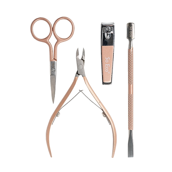 使用玫瑰金 So Eco 修指甲套装,在家中或旅途中获得专业、沙龙般的效果。使用角质层钳轻松修剪甲床周围并去除倒刺。使用双头角质层推动器塑造整齐的角质层。用不锈钢剪刀和剪刀修剪您的指甲,以获得干净的表面。