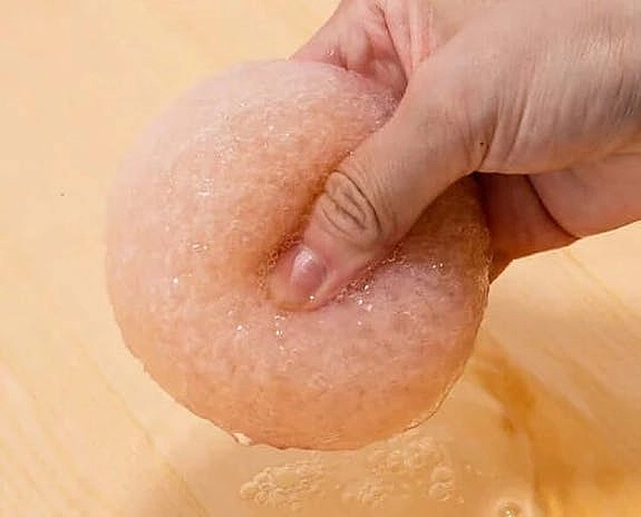 含有樱花和粉红色粘土的有机魔芋清洁海绵。